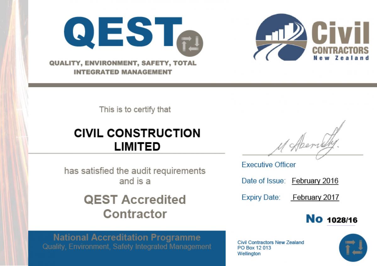 Civil Construction maintained QEST Accreditation up until 2017, and is now focusing on obtaining ISO9001 - an internationally recognized accreditation.